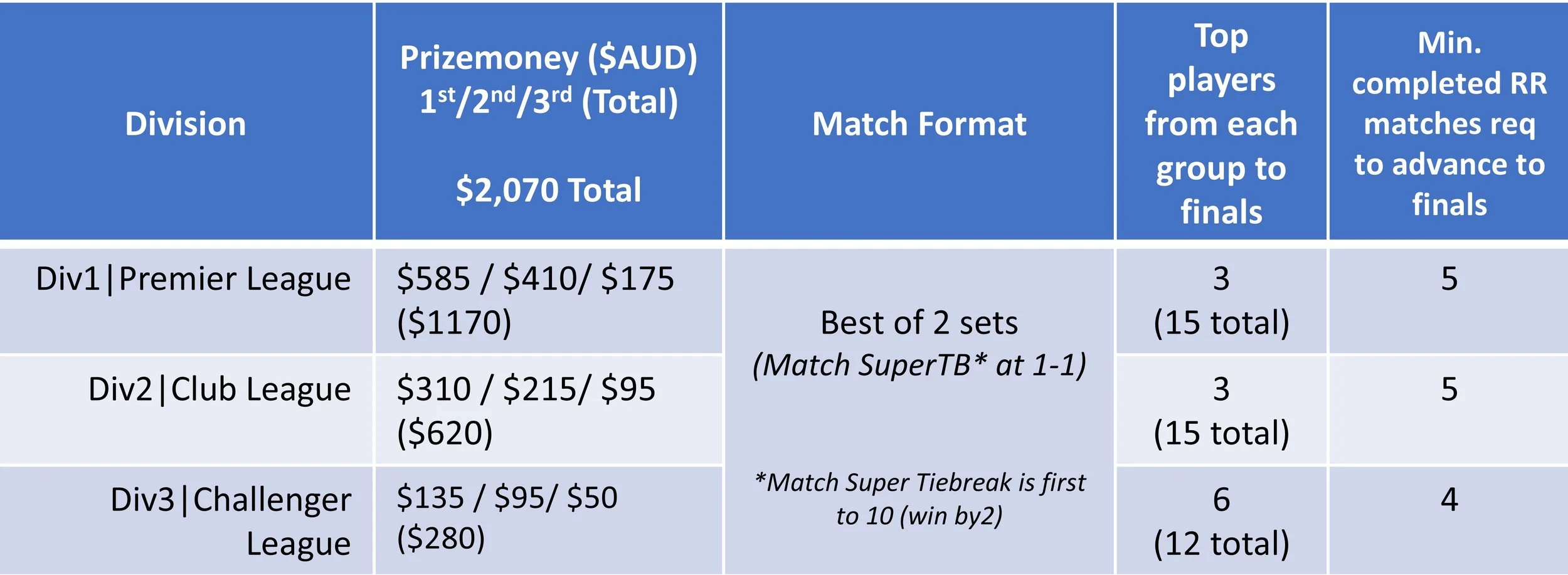 • All matches (Round Robin + Finals): Best of 2 Sets + Super Tiebreak